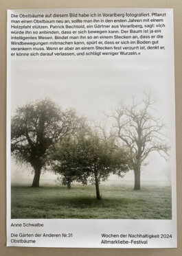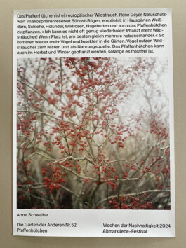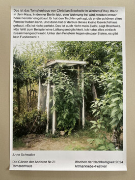 In der Altmark, dort wo ich jetzt lebe, gibt es im September die Wochen der Nachhaltigkeit. Ich freue mich, mit vier Fotografien dabei zu sein. Für diesen Anlass habe ich Gartenkolumnen zu den Themen Wildsträucher pflanzen, Nistkästen aufhängen, Gewächshaus aus alten Fenstern bauen und Obstbäume pflanzen ausgewählt. Zu sehen bis 8.Oktober 2024 im Haus Ramelow in Stendal (Sachsen-Anhalt).
